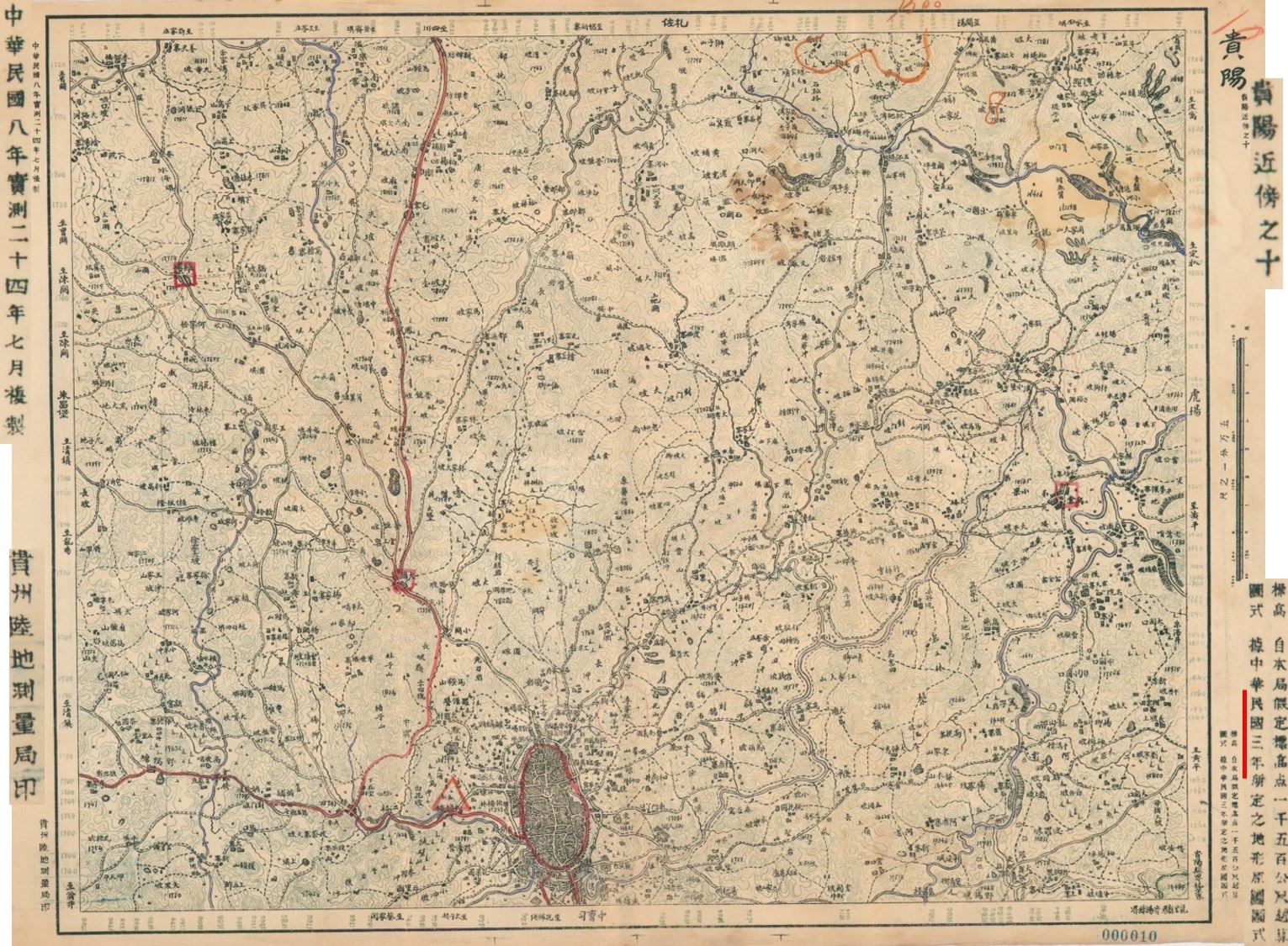 1/50,000《貴陽近傍》_貴陽 民國8年實測,24年複製 (貴州陸軍測量局),貴州省陸地測量局 55.2 x 40.0cm [本圖組係舊圖廓(矩形幅面36×46cm),於民國8年貴州陸軍測量局實測,計16幅。]