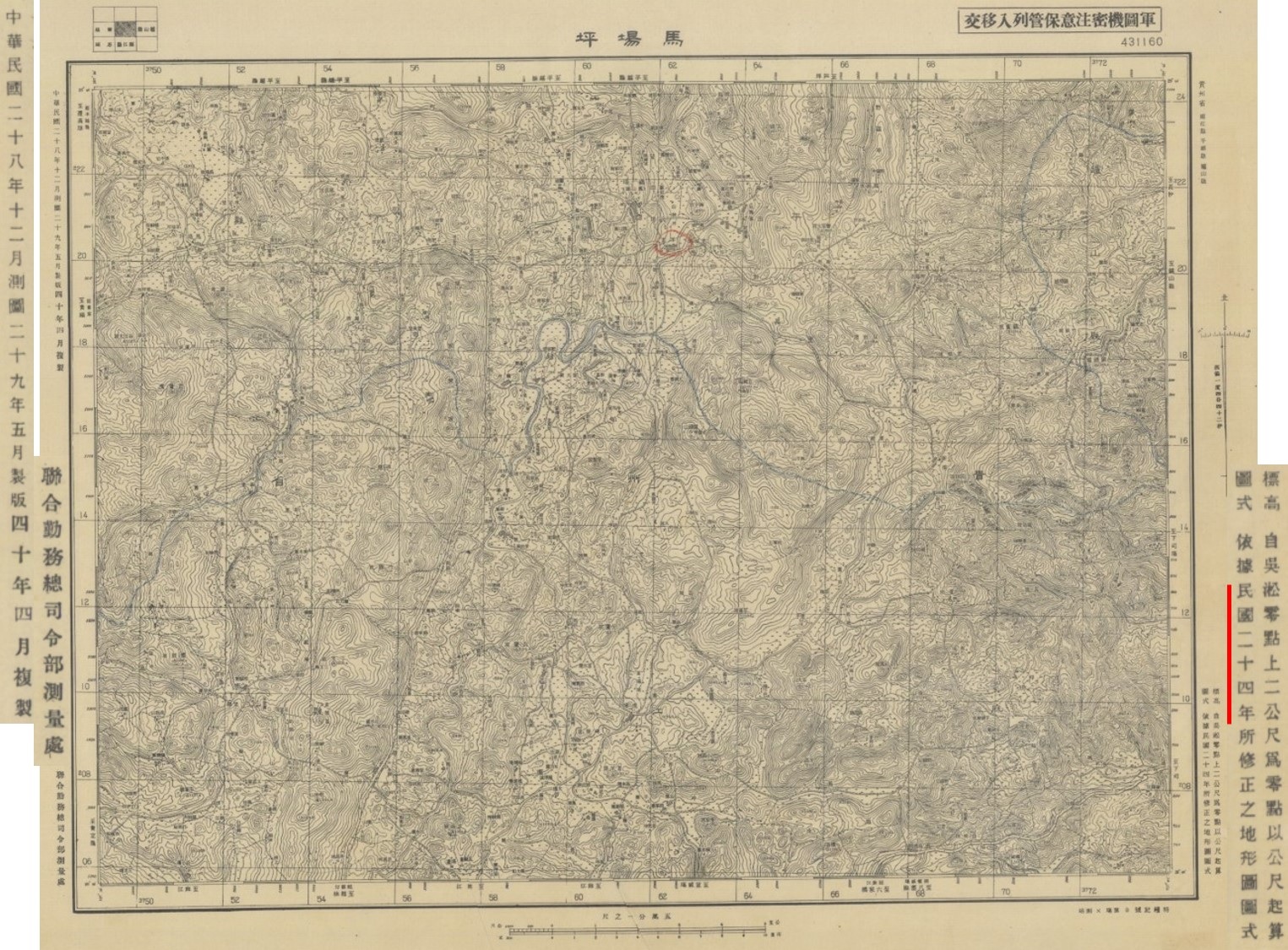 2.民國25年律定1/50,000地形圖的地圖投影統一採用蘭伯特投影,圖幅按經差15’x緯差10’分幅,稱為新圖廓。自抗戰開始後,所有新測的1/50,000地形圖全部採用新圖廓。