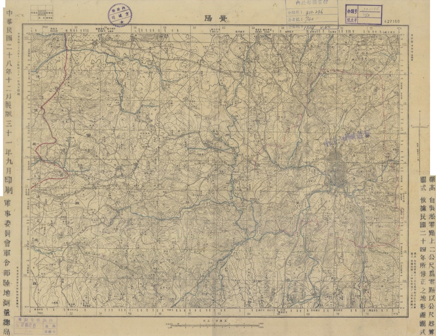 《五萬分一貴州省地形圖》_貴陽 民國28年製版、31年印刷 軍委會軍令部陸地測量總局) 15’x10’ [內政部典藏圖資(對照參用)。本圖組係與上圖組同,新圖廓五萬圖系列。]