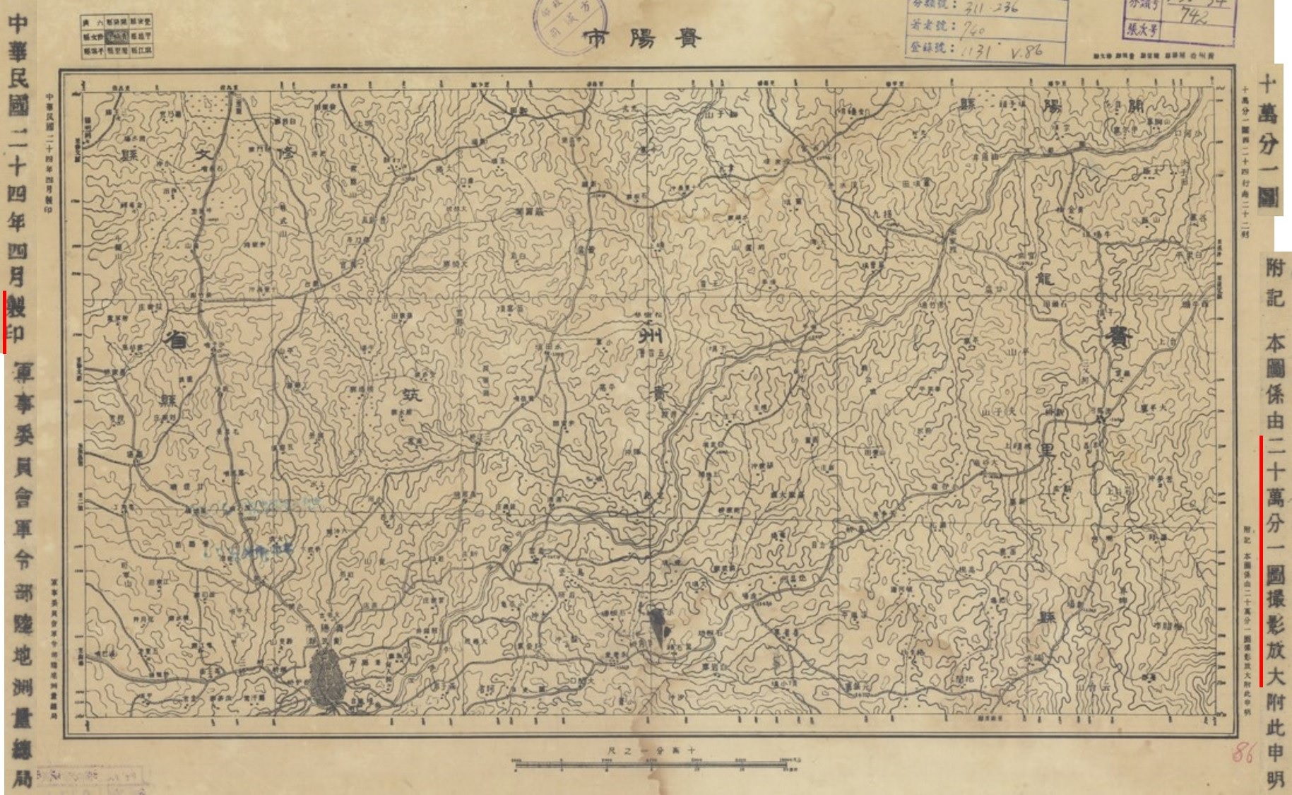 民國20年,陸地測量總局因用圖急需,根據民國9年貴州陸軍測量局編繪的1/200,000民國圖,用攝影放大的方法複製了《貴州省1/100,000地形圖》,共152幅;至此,全貴州省首次完成1/100,000地形圖覆蓋。該圖幅按經差30’x緯差15’分幅,平面為假定坐標,高程以氣壓計測自海面以零公尺起算。