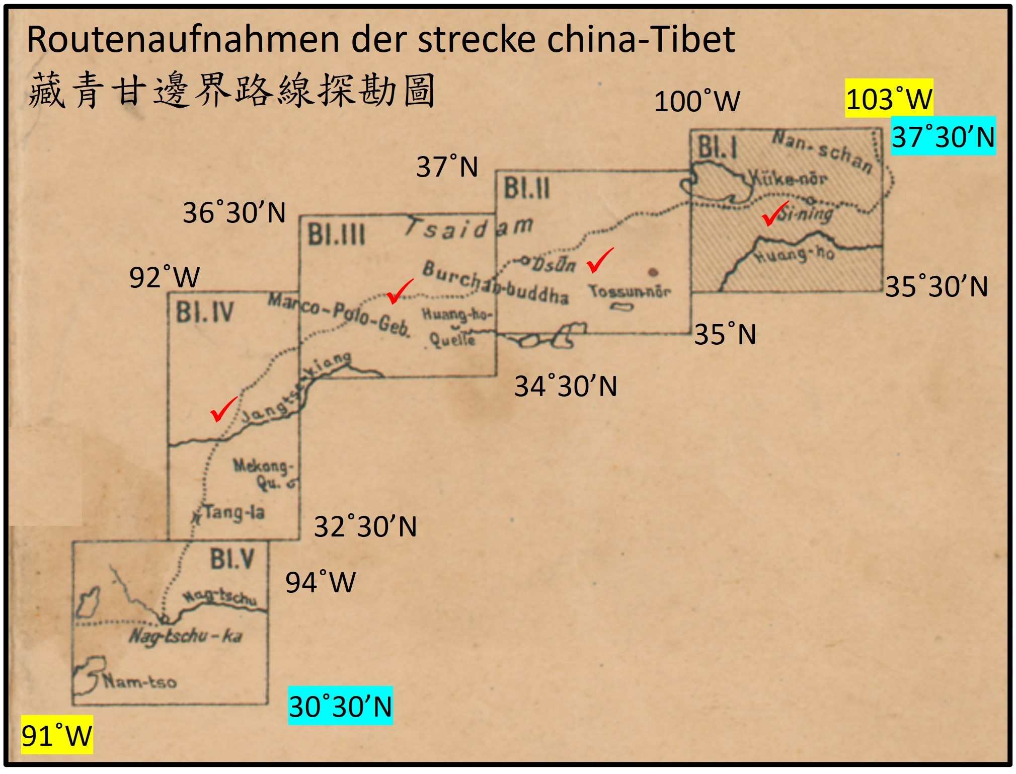1/500,000《藏青甘邊界路線探勘圖》_Blatt Ⅰ(成圖及藍晒譯註) 1926-1928年 Petermanns Geographische Mitteilungen(PGM) 3˚x2˚ [德國彼德曼地理通訊(PGM, 1855〜2004)刊載的《藏青甘邊界路線探勘圖》,計5幅(廣惠專案檢整有4幅);係1926年至1928年德國陸軍中尉費許納(Filchner)第二次勘查甘肅、青海等地(第一次是1903-1905年),所測繪之地圖。]